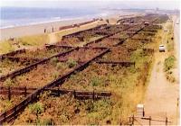 国庫補助及び県単独事業として砂防林造成(植栽や砂防柵設置など)が推進されました。この間、藤沢市辻堂(当時)の旧海軍演習地が県に払い下げられ、国道134号の付け替えと併せて、同地区の砂防林植栽を行いました。 昭和36年の第2室戸台風、昭和41年の26号台風による強風や潮風、さらにこの間の異常乾燥によって、国道の南側を中心に壊滅的な被害を受けました。国の林業試験場、東大の芝本農学博士らに指導を仰ぎ、また新たに国庫補助を受け、改植を実施。改植にあたってはクロマツとマサキ、トベラの混植や防風ネットの設置などの工法が採用されました。 |